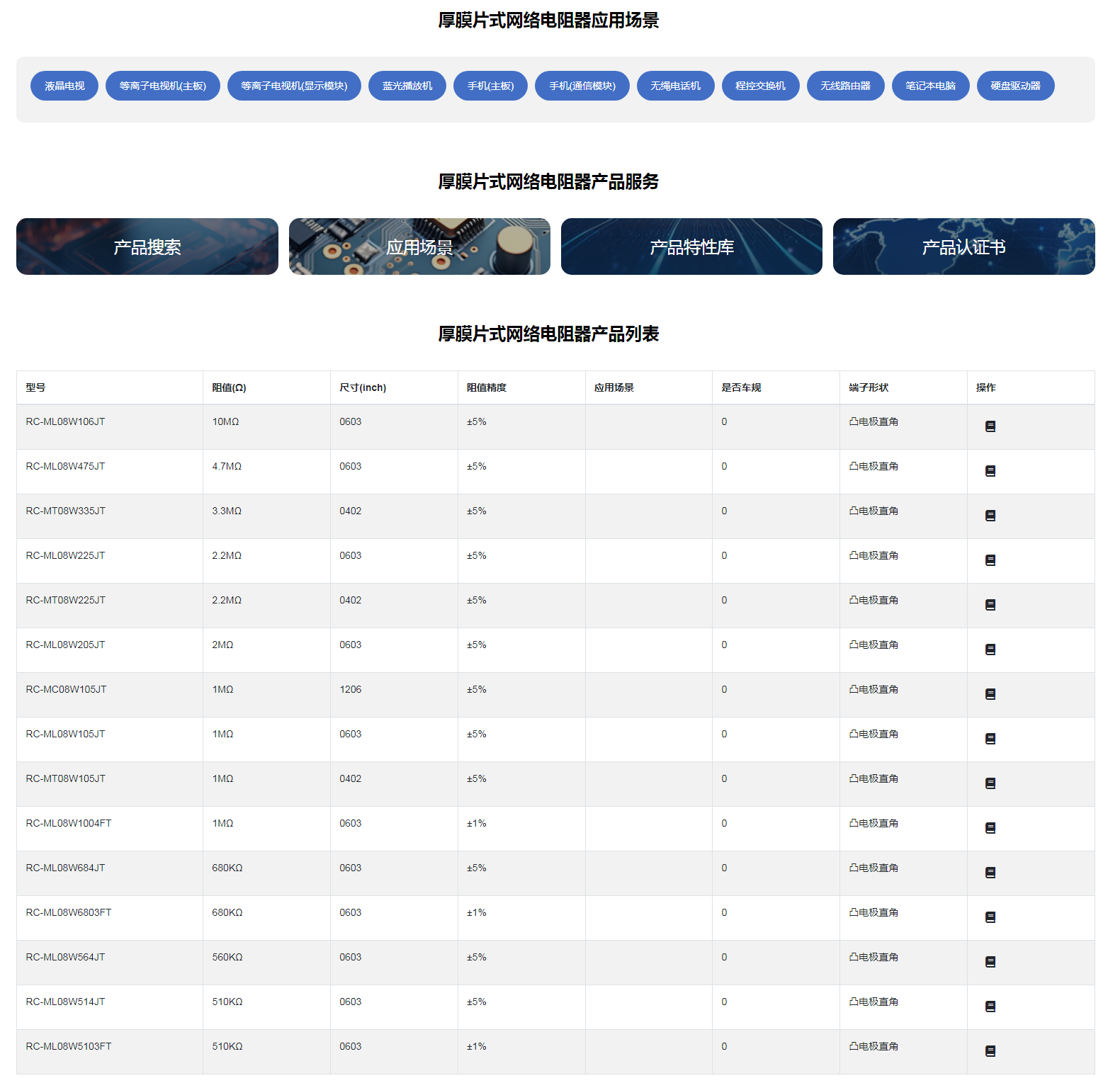 厚膜片式网络电阻器体积小、重量轻适应再流焊电性能稳定,可靠性高装配成本低,并与自动贴装设备匹配机械强度高、高频特性优越符合RoHS指令要求符合无卤素要求应用领域:广泛应用于家电、计算机、通讯、工业自动化及消费类电子产品等领域。