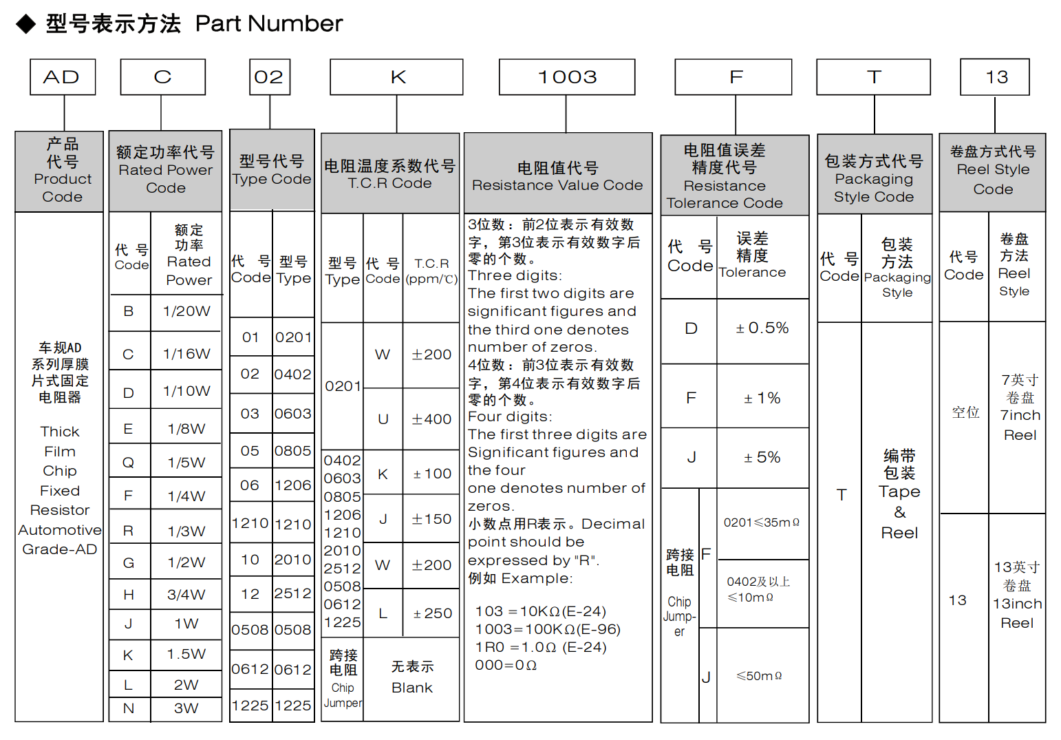 车规AD系列厚膜片式固定电阻器符合AEC-Q200汽车标准相关条款体积小、重量轻适应再流焊与波峰焊电性能稳定,可靠性高装配成本低,并与自动贴装设备匹配机械强度高、高频特性优越具有良好的抗硫化能力符合RoHS指令要求符合无卤素要求应用领域:汽车信息系统、车载导航系统、影音娱乐系统、发动机动力控制系统、车身电子