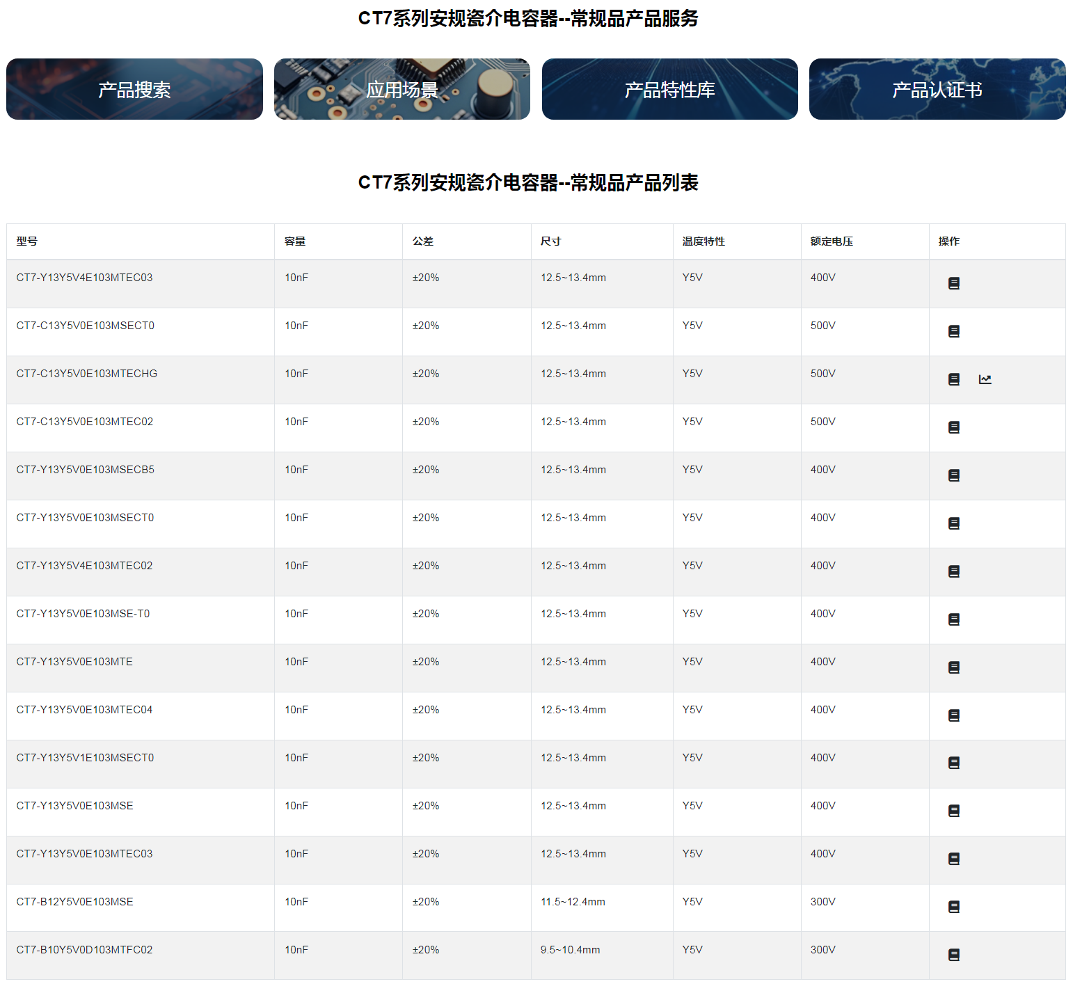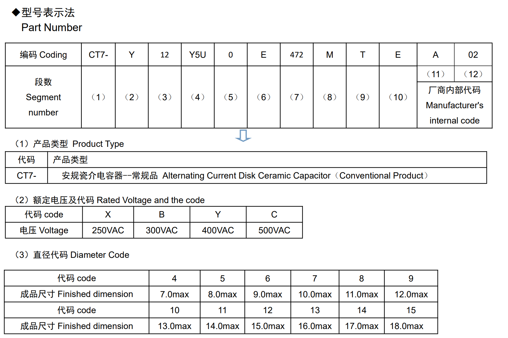 ■CT7 系列安规瓷介电容器--常规品◆特征* 符合 GB/T 6346.14-2015/IEC 60384.14-2005认证标准。* 绝缘性能好、耐压保险系数大,能承受较大脉冲电压冲击。◆应用* 适于在电子设备中作为跨电源线连接、天线耦合、旁路、滤波等。