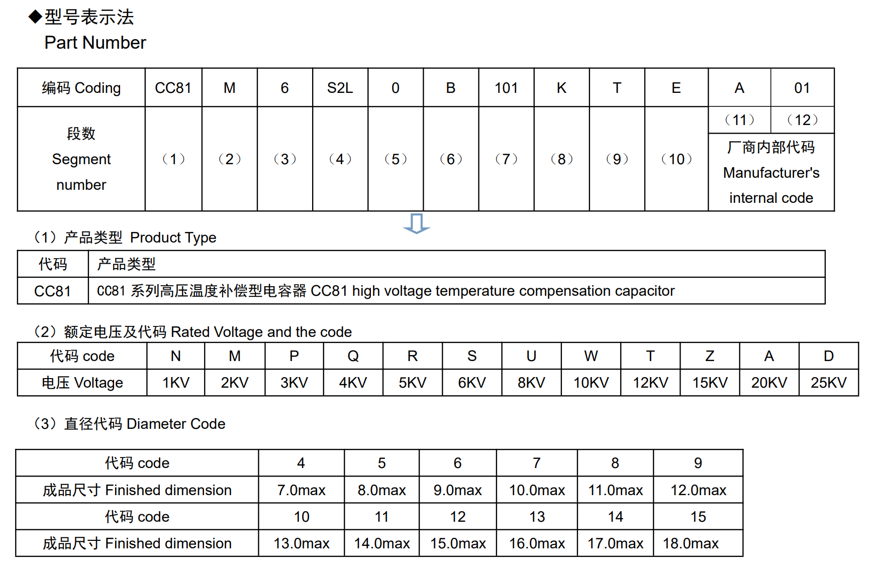 ■CC81 系列高压温度补偿型电容器◆特征*符合 GB/T 5966 / IEC 384-8 认证标准。*损耗值小、容量稳定性高;耐压水平较高。◆应用* 用于要求损耗值小、容量稳定性要求较高的电路中:谐振回路、高频旁路、温度补偿、控制电路的时间常数元件、稳定性要求高的耦合元件。