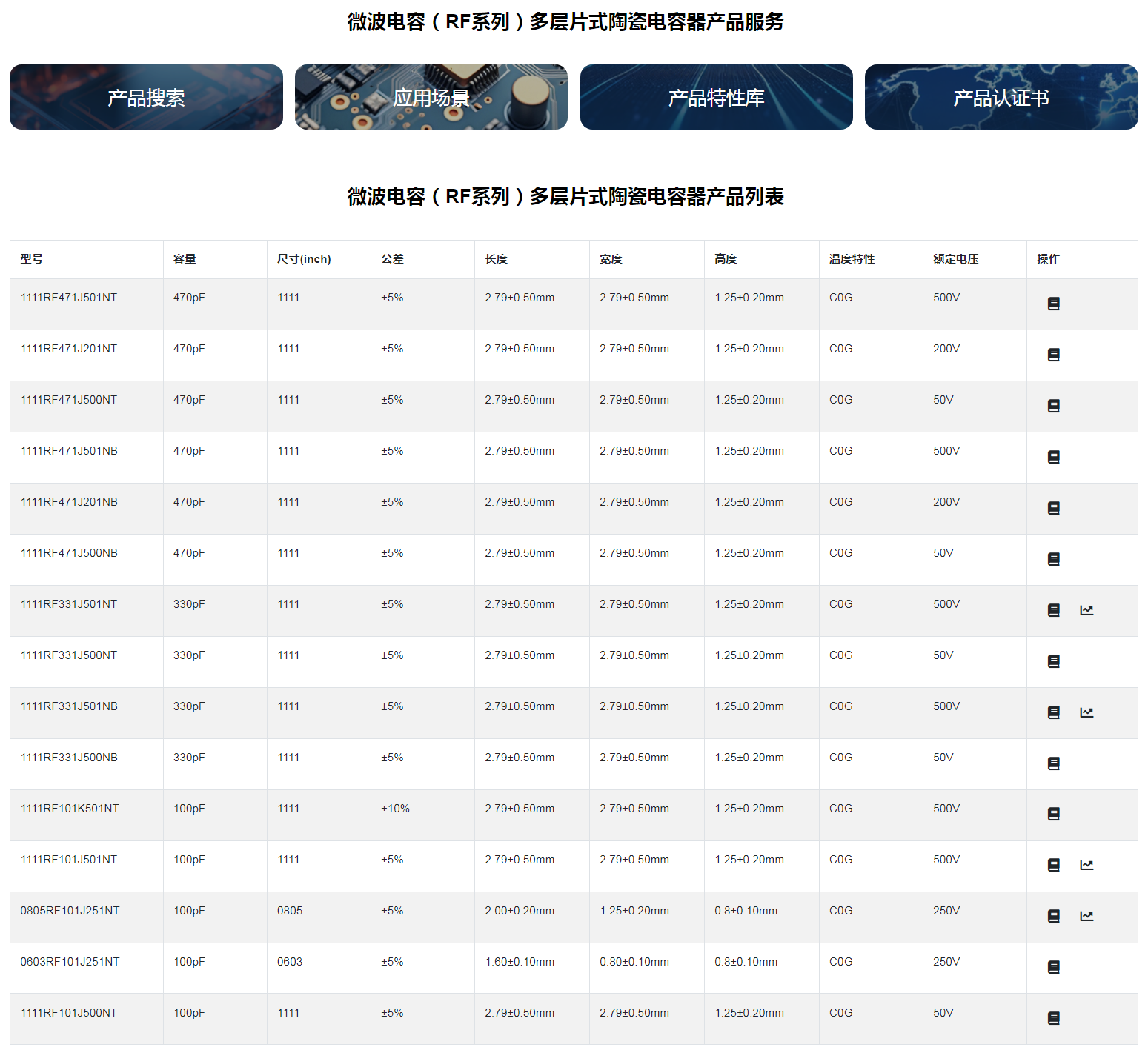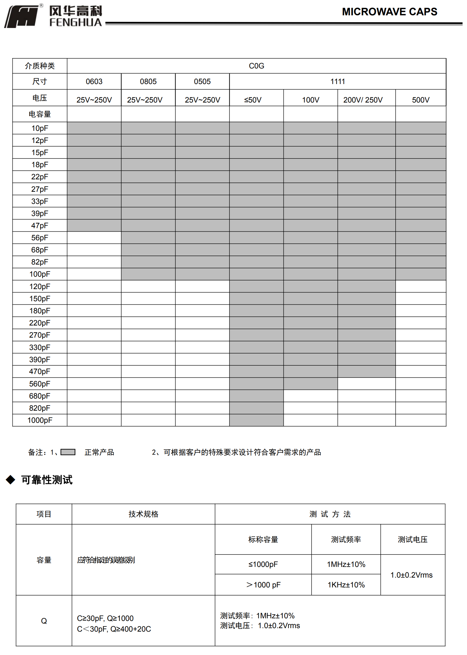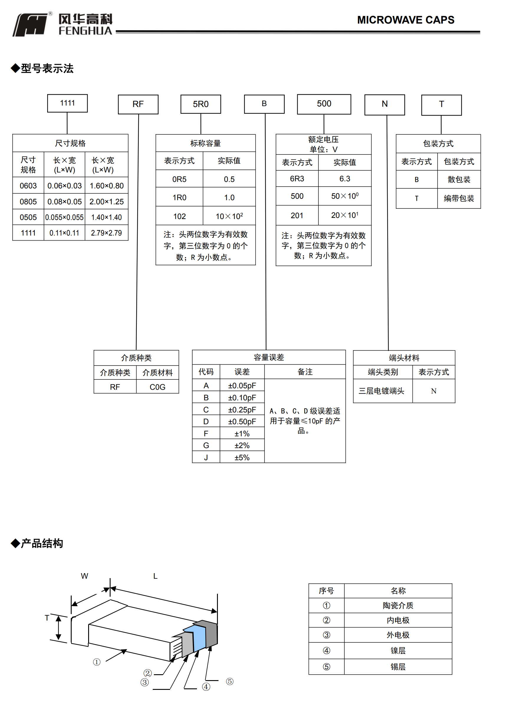 微波电容(RF系列)多层片式陶瓷电容器◆ 特征* 叠层独石结构,具有高可靠性能* 具有优良的焊接与耐焊性能,适用于回流焊接与波峰焊接* 具有较高的容量且容量性能稳定* 高 Q 值* 低等效串联电阻* 高自谐振频率* 执行标准:GB/T 21041-200◆ 应用* 移动通信基站* 无线通信产* 射频功率放大器* 阻抗匹配网络* 滤波网络* VCO
