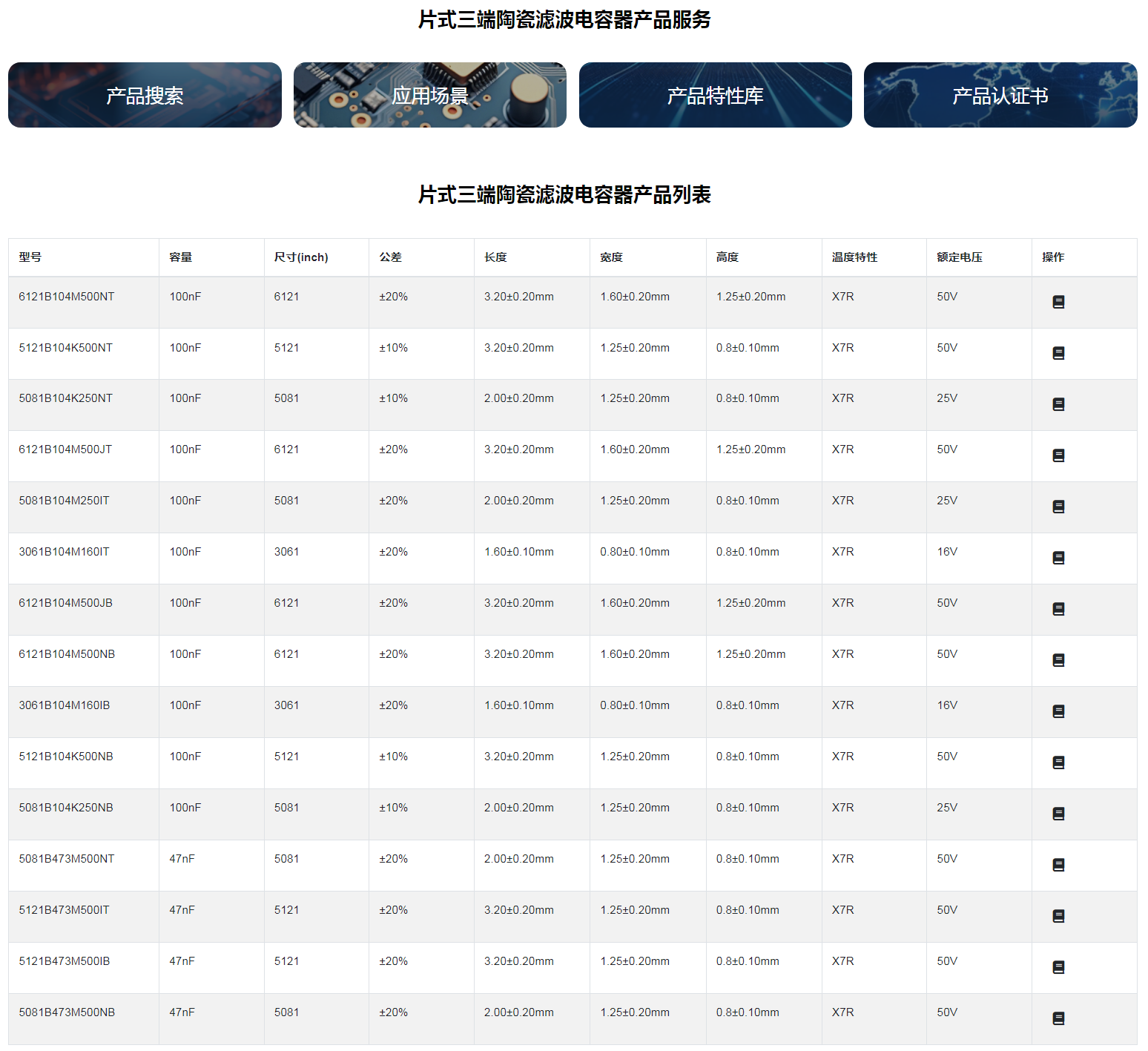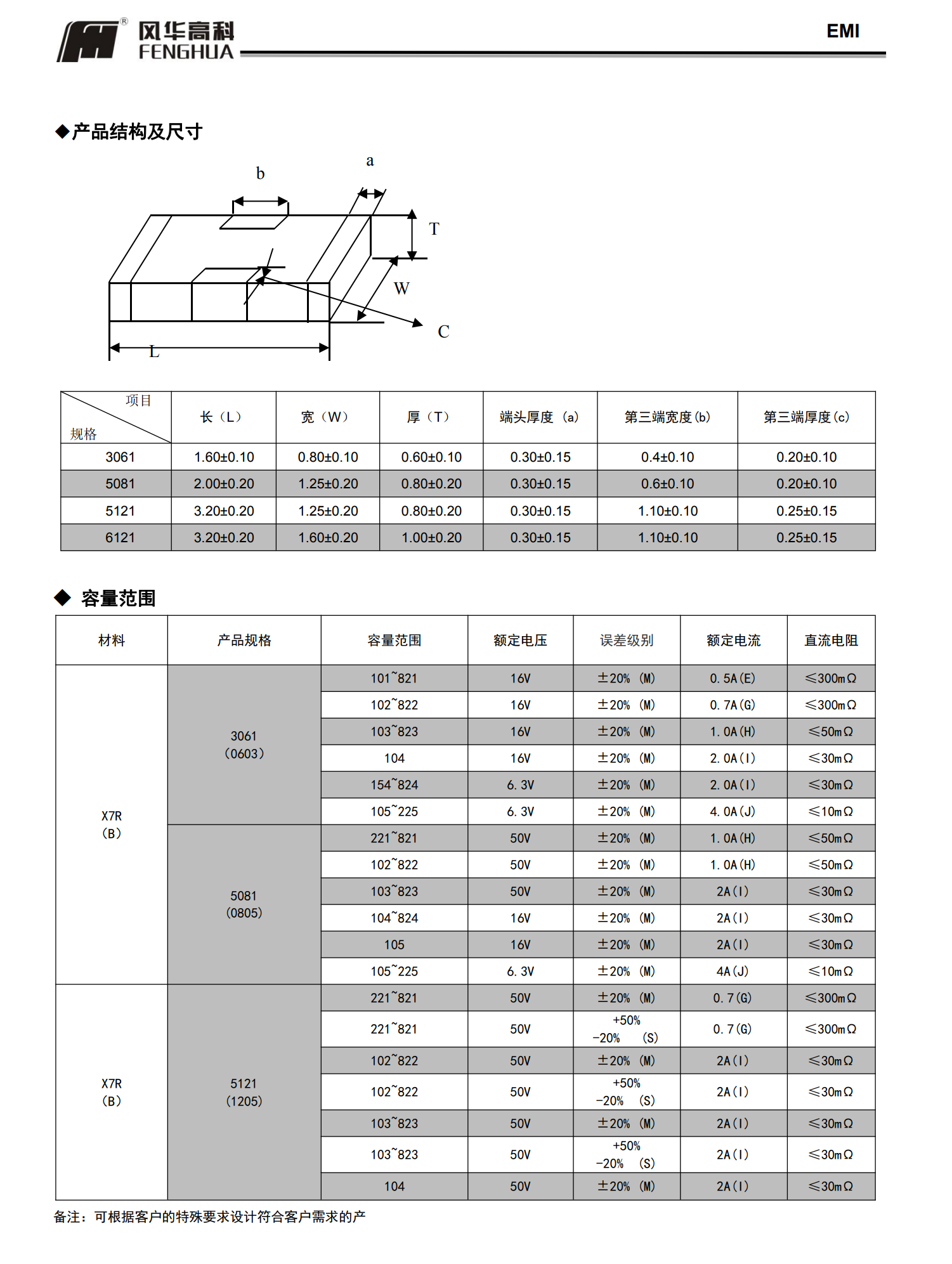 ■ 片式三端陶瓷滤波电容器(EMI)◆ 特征* 叠层独石结构,具有高可靠性能* 具有优良的通流特性* 无极性,适合高密度的表面安装* 具有优良的滤波特性* 具有良好的吸收噪音、抑制浪涌脉冲的作用.* 具有良好的可焊与耐焊性能* 执行标准:GB/T 21041-2007 GB/T 21042-2007◆ 应用* 移动电话及基站* 通信设备* 自动化仪表和程序