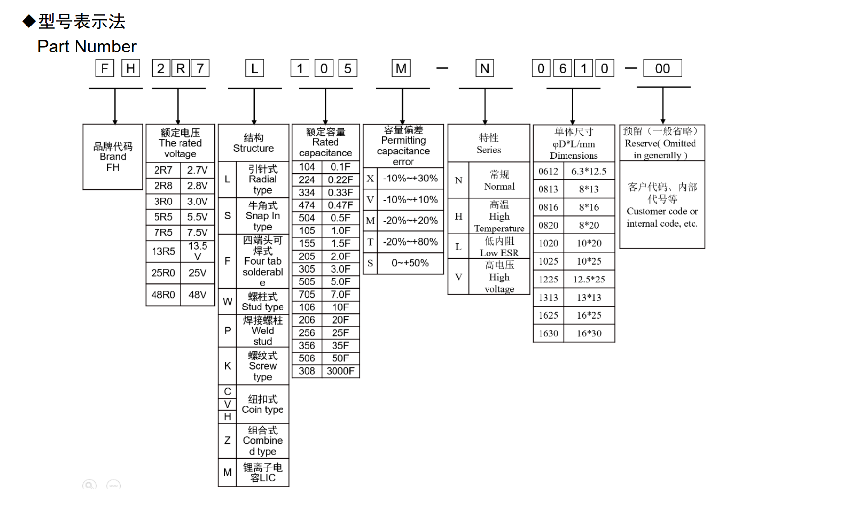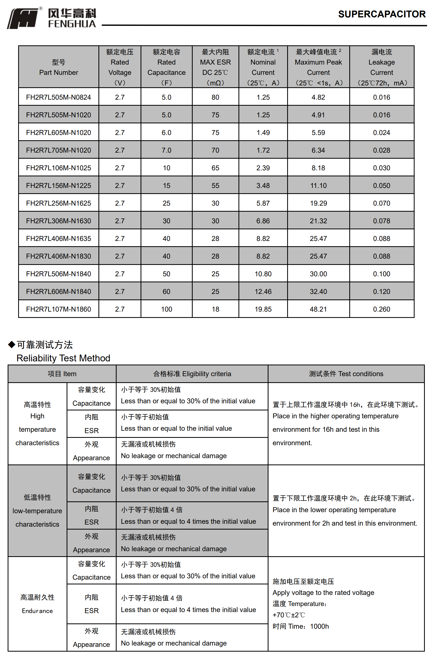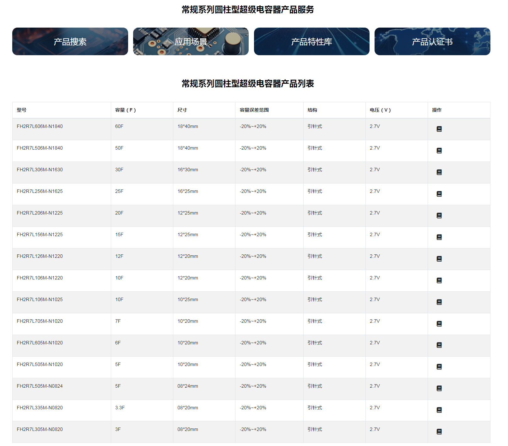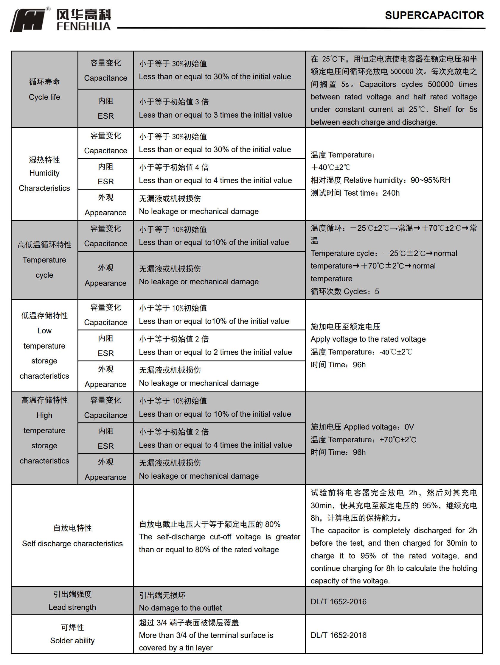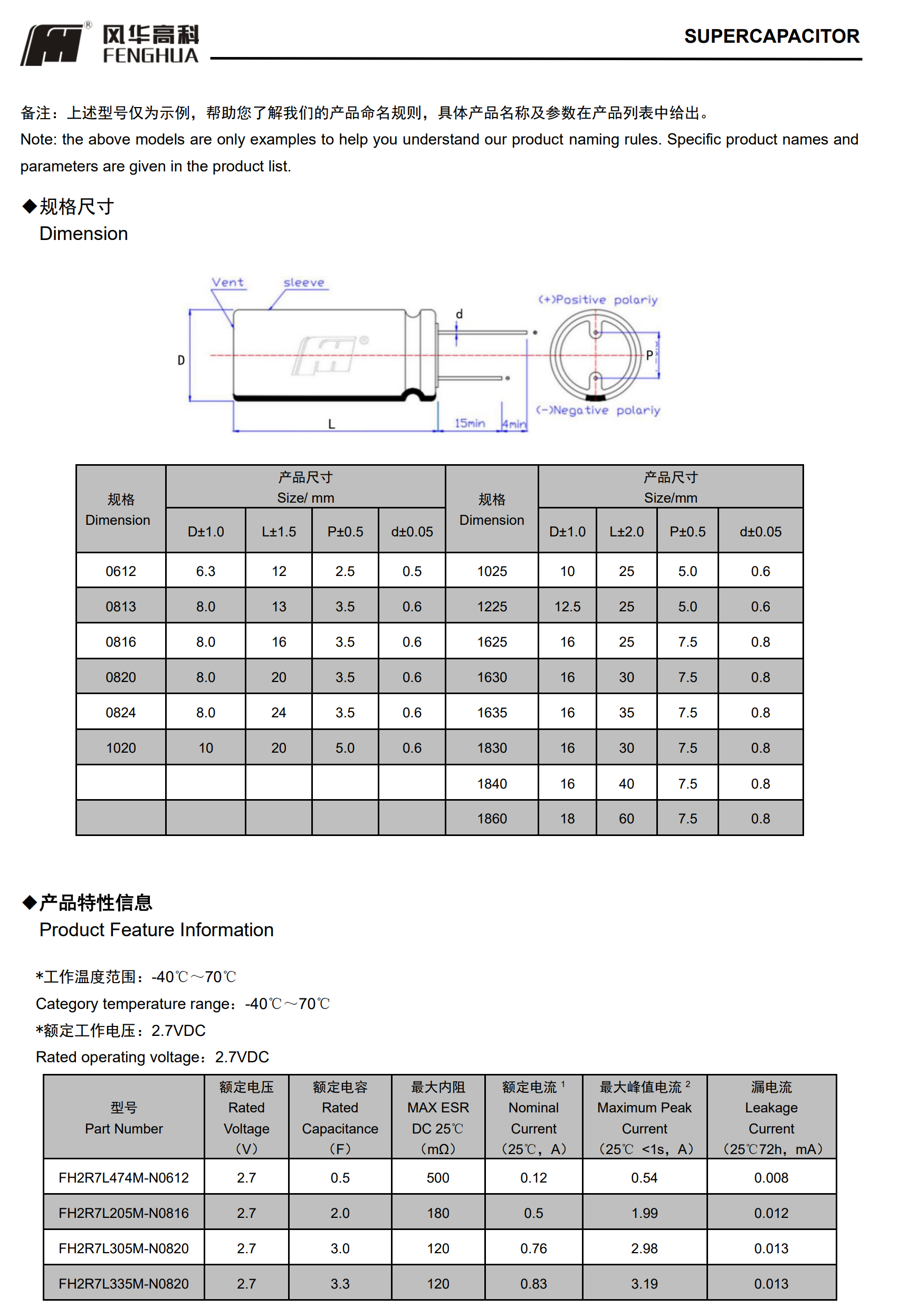 ■常规系列圆柱型超级电容器◆特征* 内阻低,功率密度高* 自放电率小,72 小时自放电<20%*优异的循环寿命,库仑效率达 95%以上*工作温度范围宽;*绿色环保,满足 RoHs 要求◆应用* 智能仪表、行车记录仪、照明灯具、智能家居、工业控制;* 税控收款机、数码相机、电动工具、电动玩具、备用电源;*无线节能鼠标、无线手写