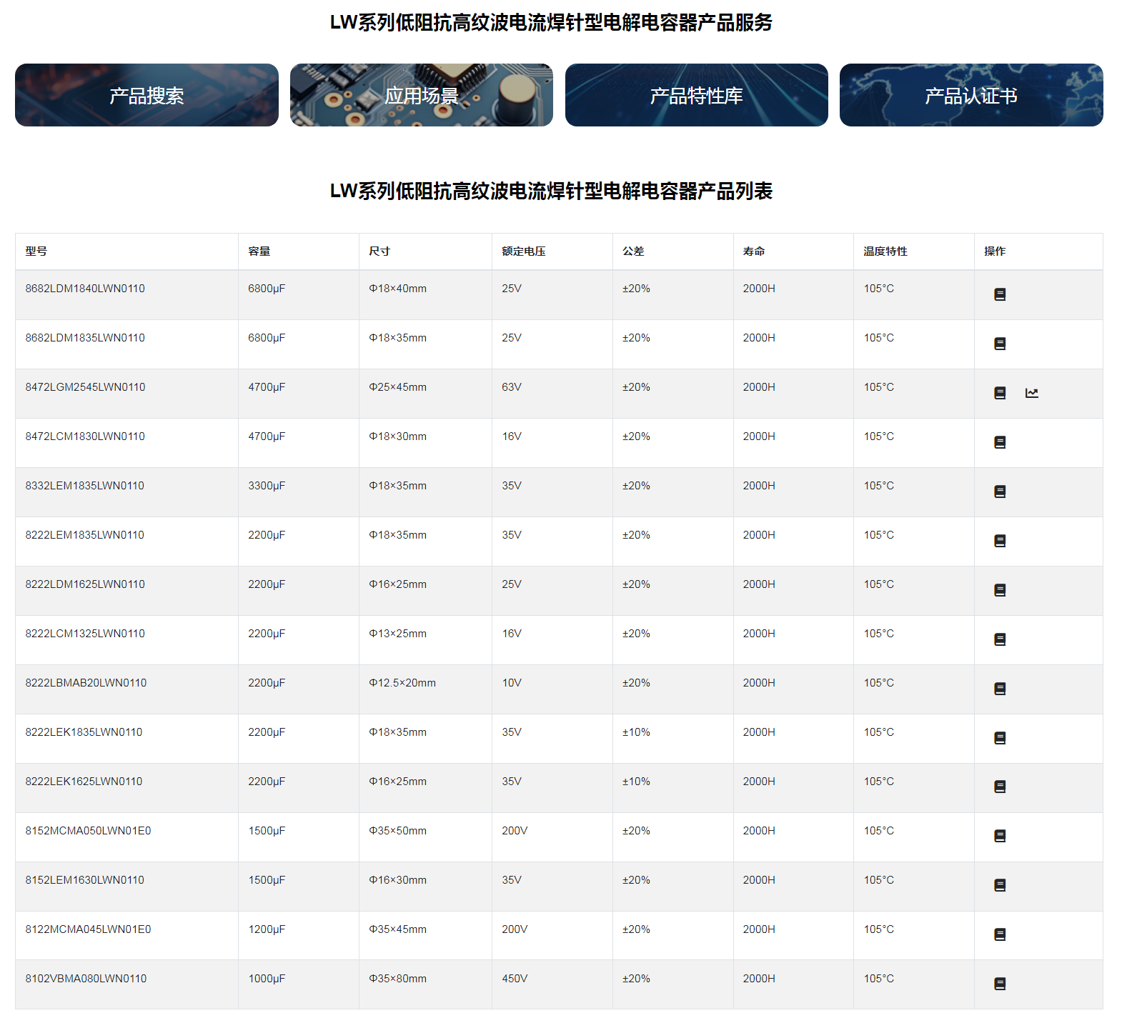 ■ LW系列低阻抗高纹波电流焊针型电解电容器◆特性:寿命: 105℃ 2000小时;适用于-40℃ 超低环境、大纹波电流;符合RoHS;◆应用:适用于充电桩、饲服器、通信设备及其它各种电子产品。