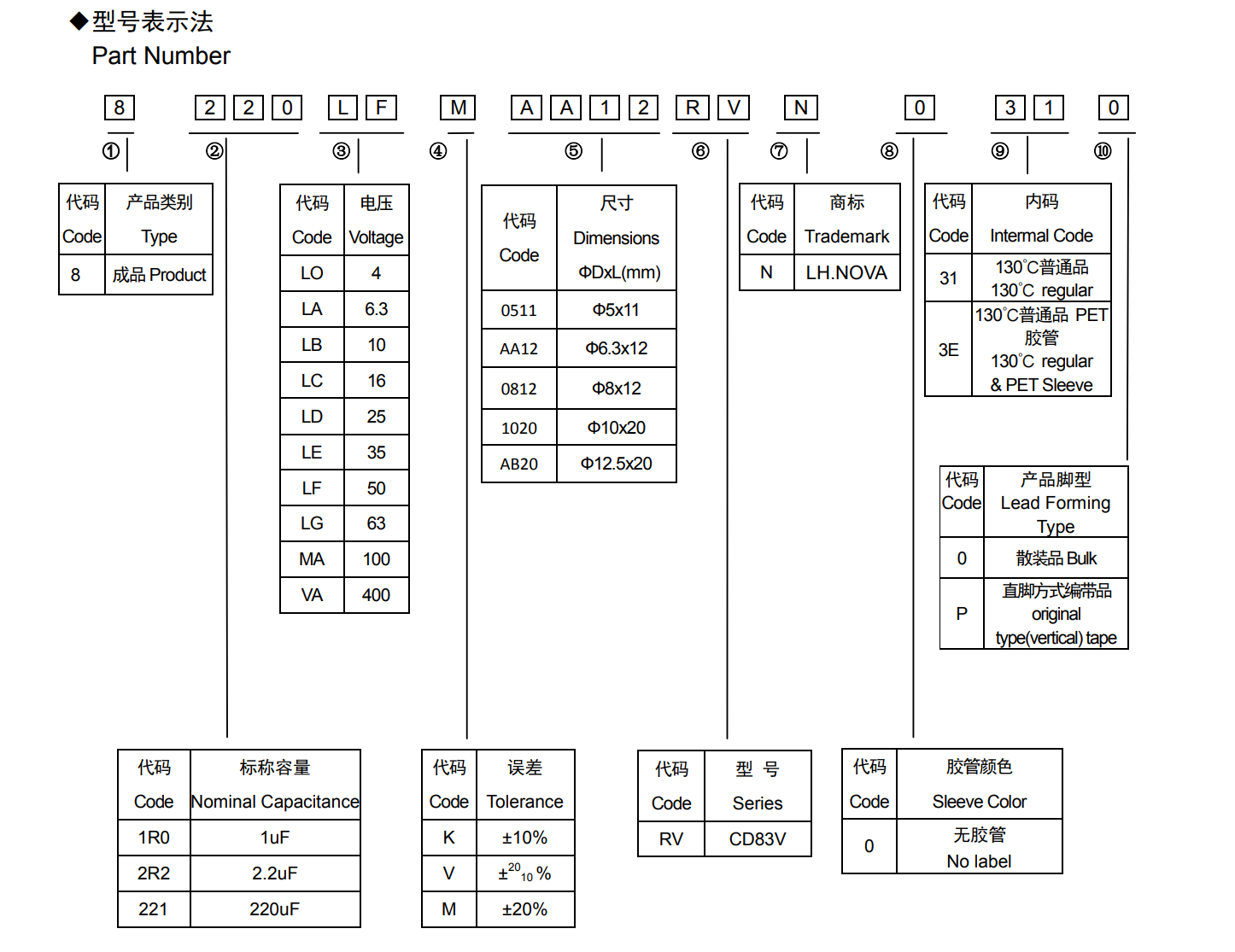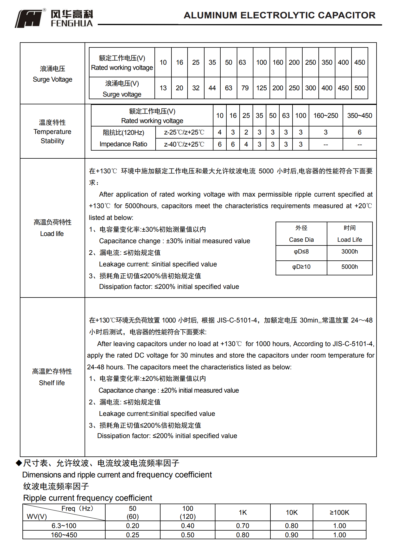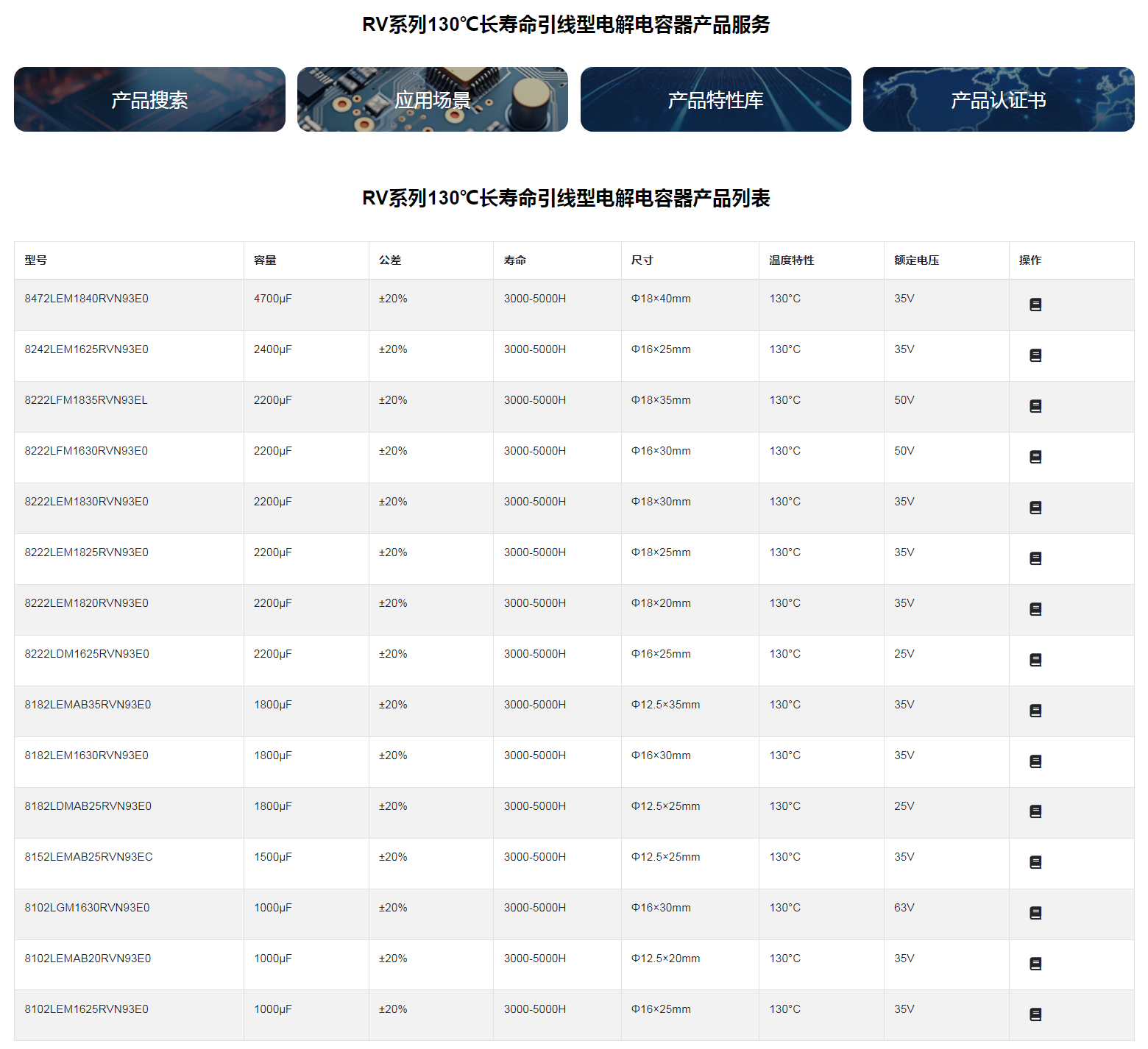 ■RV系列130℃长寿命引线型电解电容器◆特征* 寿命: 130℃ 3000~5000 小时* 耐高温* 符合 RoHS◆应用:*适用于汽车电子 、各类开关电源、LED 照明产品 、 LED 驱动器等电子产品