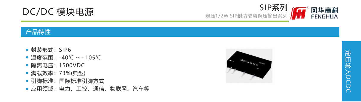 产品特性:封装形式:SIP6温度范围:-40℃~+105°C隔离电压:1500VDC满载效率:73%(典型)引脚标准:国际标准引脚方式应用领域:电力、工控、通信、物联网、汽车等