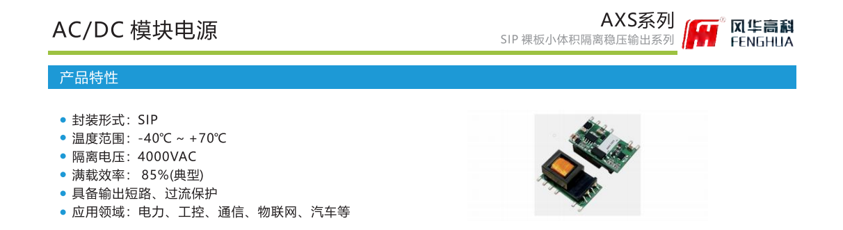 产品特性:封装形式:SIP温度范围:-40℃~+70℃隔离电压:4000VAC满载效率: 85%(典型)具备输出短路、过流保护应用领域:电力、工控、通信、物联网、汽车等